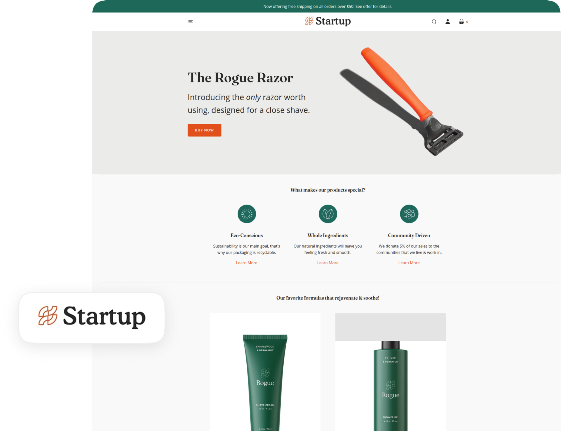 The Startup theme is perfect for businesses that sell a few products since it has a clean, conversion-focused layout.